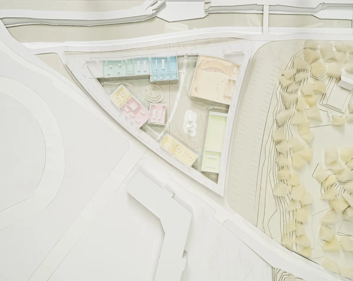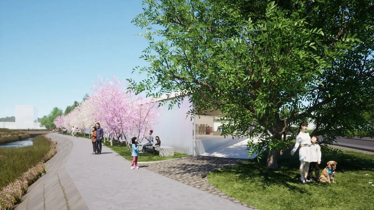 多様な個人の居場所を大切にするため、広い公園内に諸室を分棟形式で離散して配置しました。これは、他者との交流を好む方だけでなく、他者との適度な距離を大切にする方に対しても配慮しています。また、分棟同士は、周遊可能で細長い回廊と隣接することで、ひと繋がりの空間として施設を一体的に利用できます。回廊型の逍遥空間は、大きなひとつながりの縁側空間のように施設利用に目的がない人でも色々な方向から自由に通り抜け、滞在したりと様々な場が生まれます。
