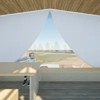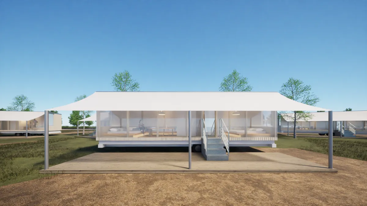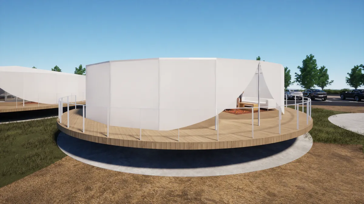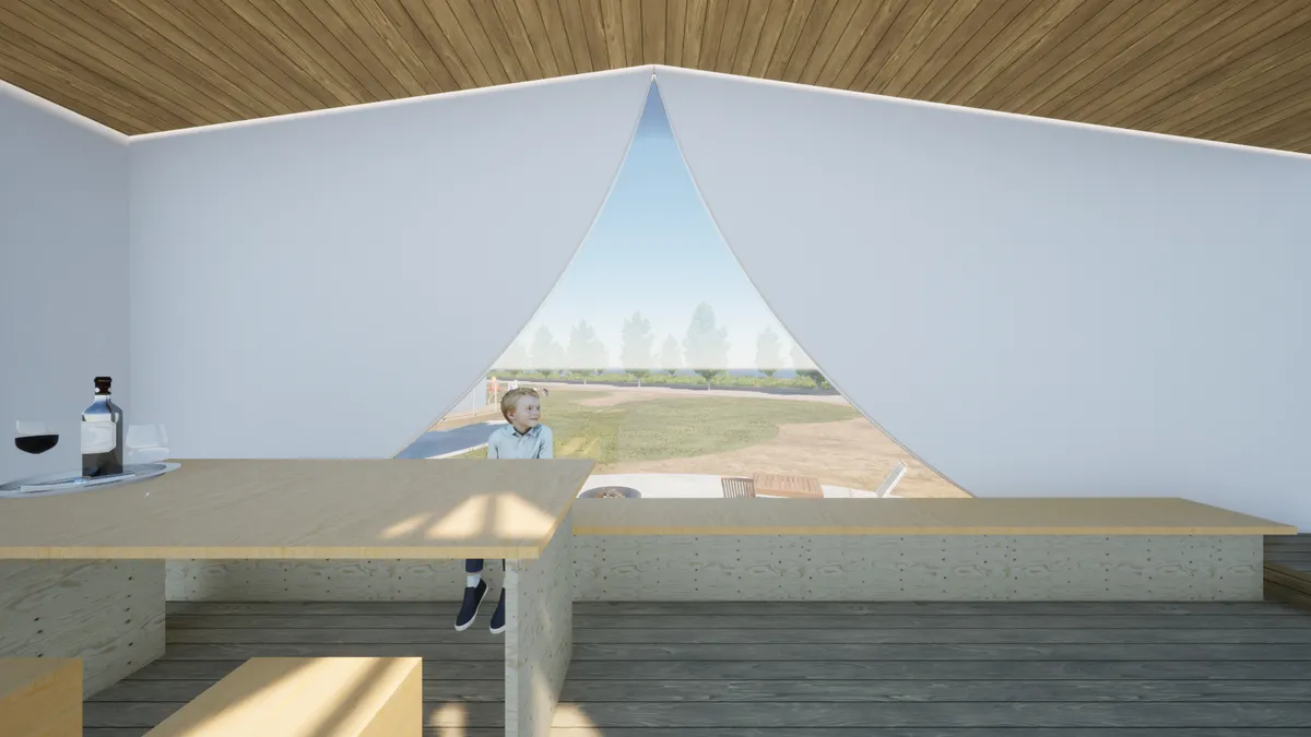 建築は、周辺環境への負荷を抑えた軽やかな構成とし、木やファブリックなどの素材を用いることで、海辺の風景に溶け込む柔らかな表情をつくり出しています。構造的にも可搬性や施工性に配慮し、将来的な更新や運用の柔軟性にも応える計画としました。