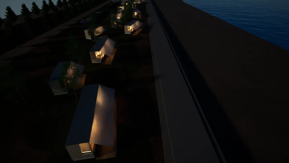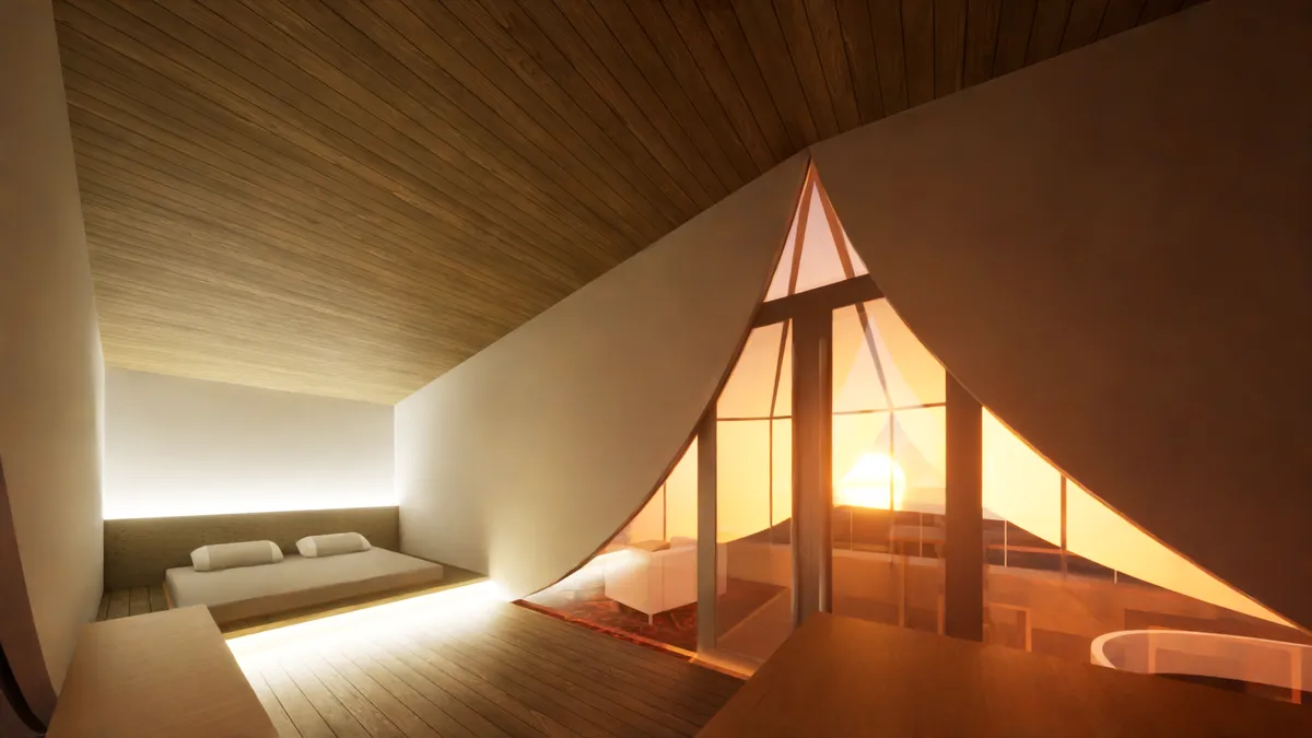 昼間は海と空の広がりの中で過ごし、夕刻には水平線に沈む夕日を眺め、夜には焚火や照明によって親密な空間へと変化するなど、時間の移ろいそのものを体験として取り込むことを意図しています。