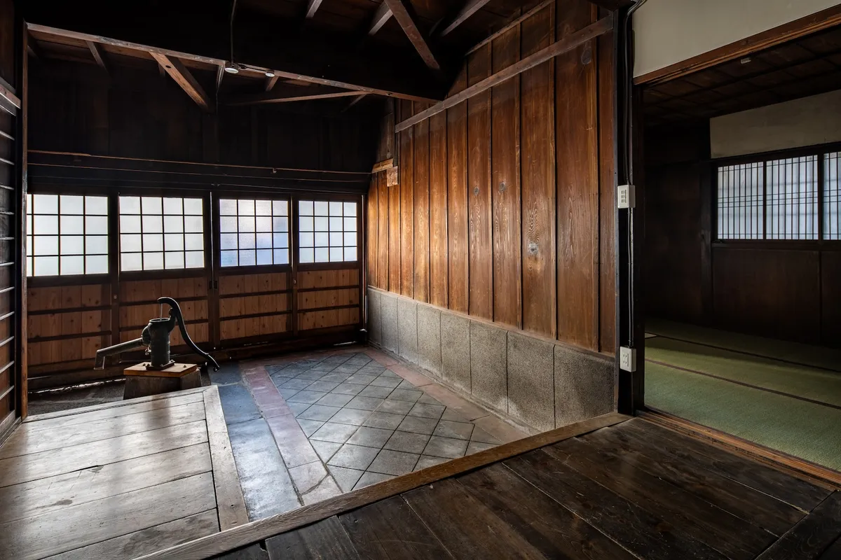 最大限に既存を活用し、改修が必要な箇所についても佃島の景観に合う材料や色を採用しました。 手押しポンプのある土間の入口の鴨居には、商家のステータスとなる背の高い人見梁が用いられています。また大八車がスムーズに出入りできるように敷居は取り外し可能な仕様になっています。 私たちは劣化が激しかった建具部分の改修を行い、魚問屋であった旧飯田家住宅の顔とも言える商いの場を、佃島の町並として保存しました。