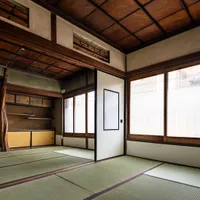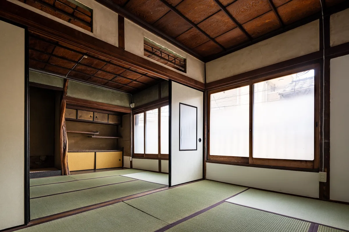 屋内空間は建具を中心に改修を行いました。垂壁や柱梁の雰囲気に合わせて色を選び、改修前よりも部屋に統一感が生まれながらも町屋の風情は残しています。 「表座敷・上」と「表座敷・下」が連続する本住宅で1 番大きな空間は、漆喰をイメージした白を基調とすることで爽やかで開放感のある仕上がりになりました。収納や廊下に面する扉は周囲の建築部材と同系統の色を選択しつつも、空間を明快にするアクセントカラーになっています。