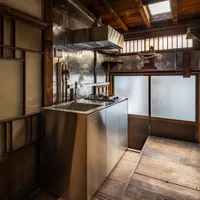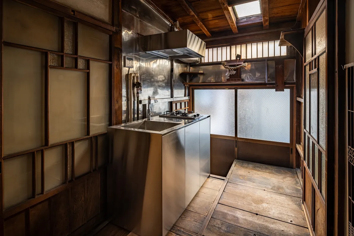 システムキッチンを導入し、最低限の調理環境を整備しました。ステンレス素材のキッチンは木質の建築に対して良いコントラストになっています。 他にもウォシュレット付きのトイレを導入するなど、現代人の生活スタイルに合わせた仕様に更新しました。