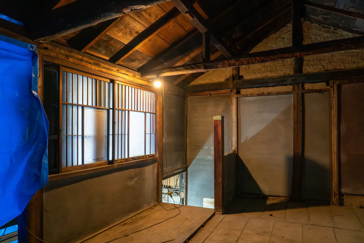 空間構成において特筆すべきは、二階部分の座敷です。現在の二階は昭和初期の改造によるもので、当初は天井の低い「ツシ二階」であったと推測されます。また、梁間を二間に抑えつつ、前面に幅一間の大きな下屋を設けて「前台所・前便所」を配置する形式は、佃における古い住居形式をよく伝えるものです。こうした構成は、限られた敷地の中で生活機能を柔軟に展開する知恵であり、地域固有の住まい方を体現しています。
